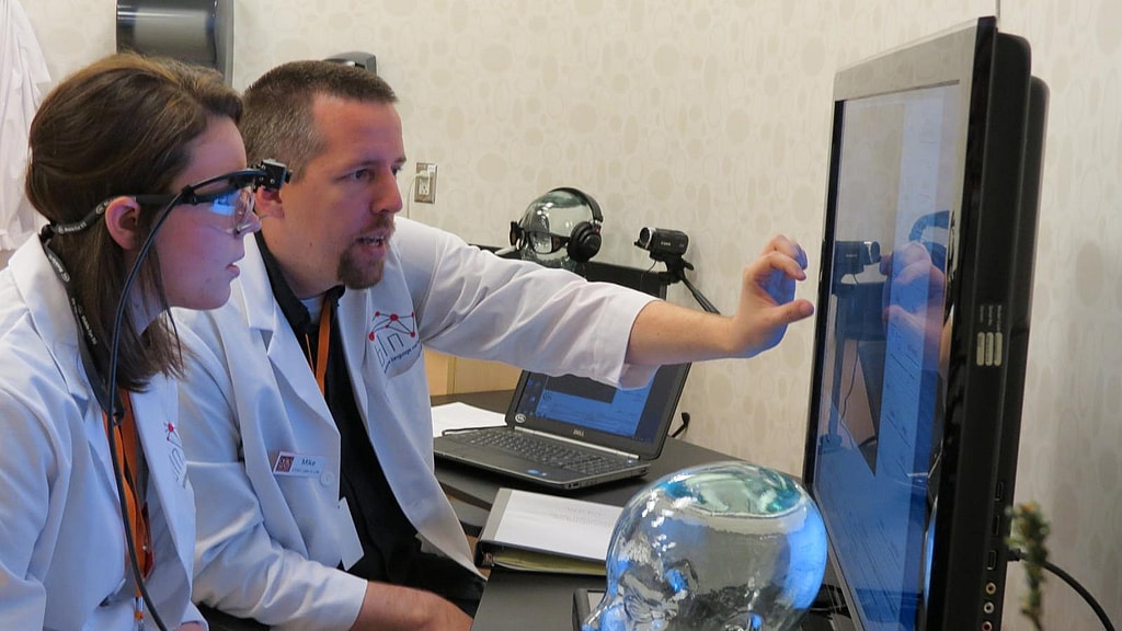 A researcher doing research in a lab coat at COSI